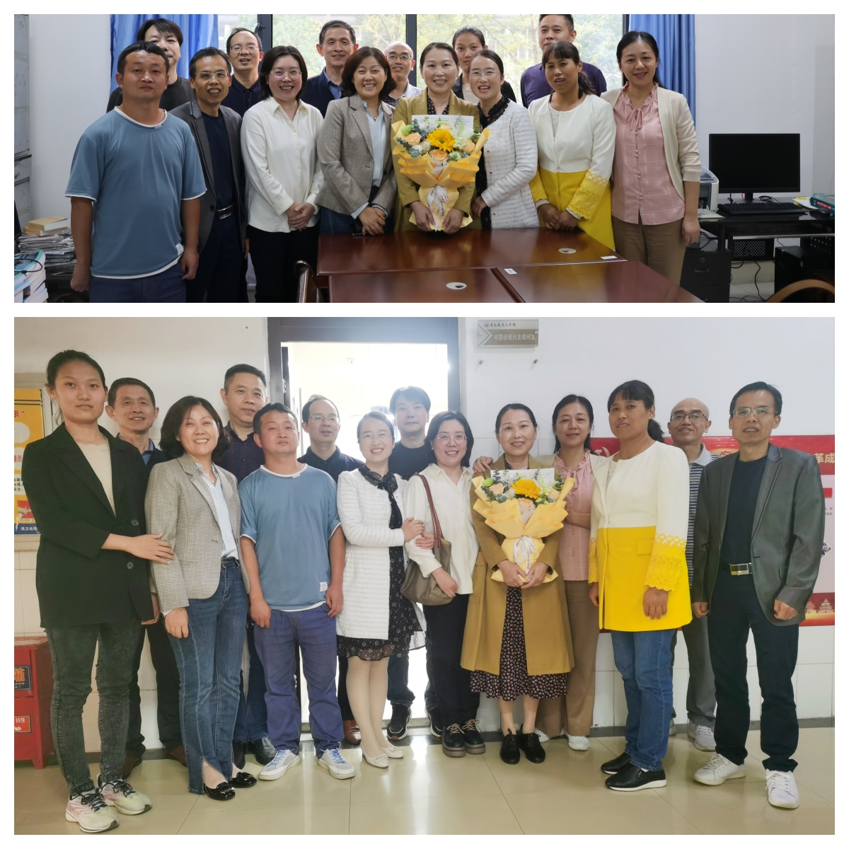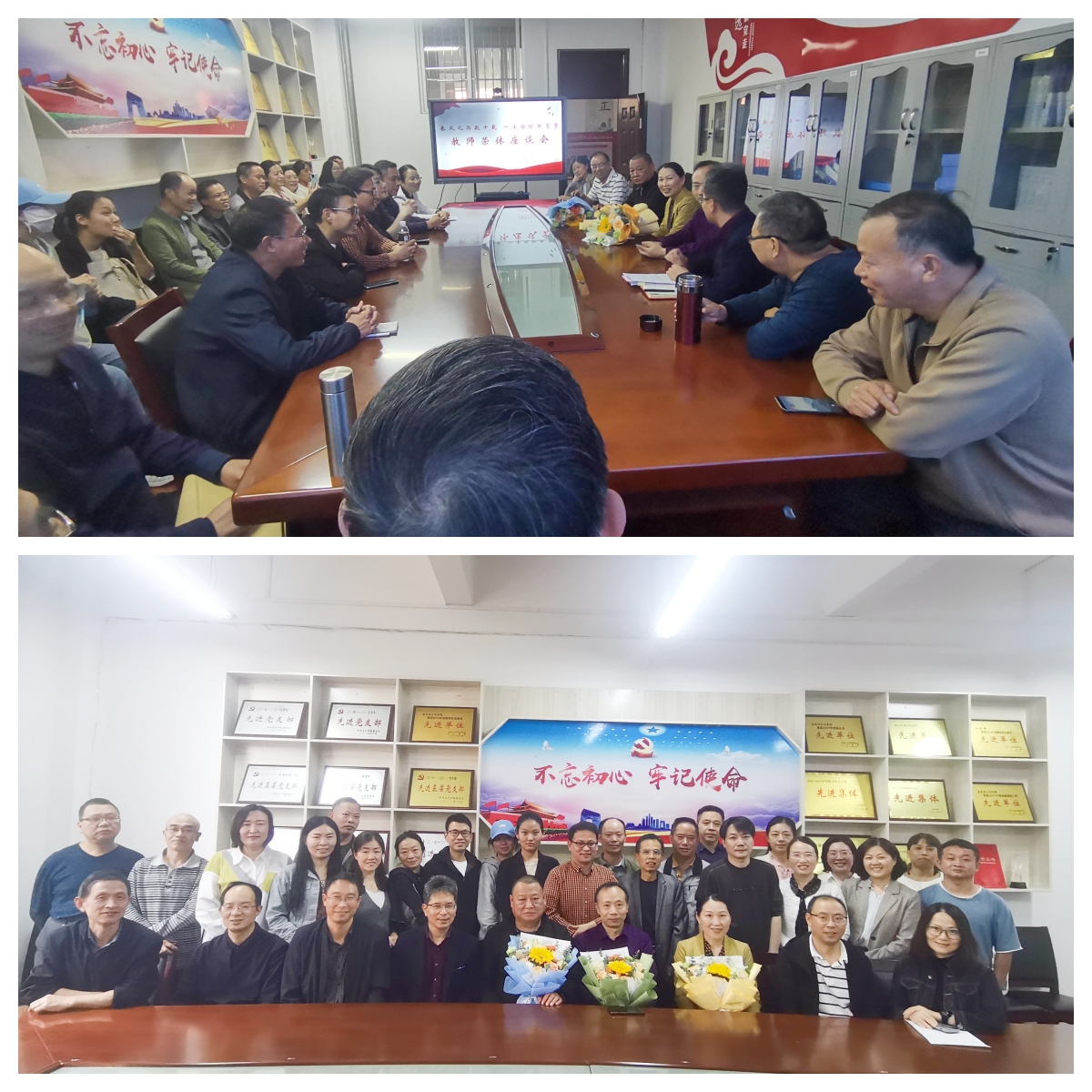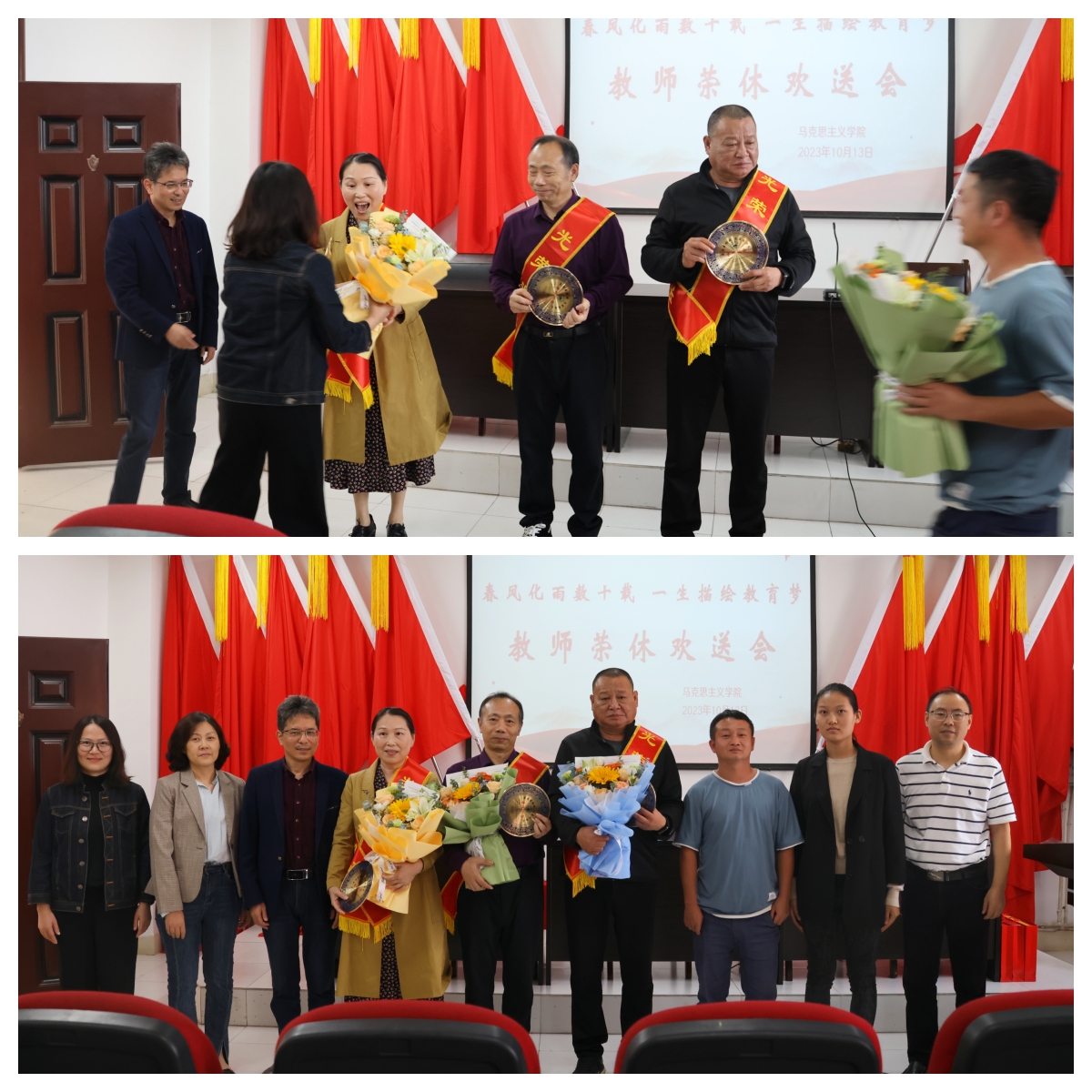 岁月映初心,薪火永相传。经理陈胜才、副经理郑小东、党委副书记李雪为他们颁发荣休纪念品。新入职教师段谟发博士、刘系周博士、谢明利老师为他们献上鲜花,表示要以光荣退休的前辈们为榜样,奋发进取,砥砺前行。